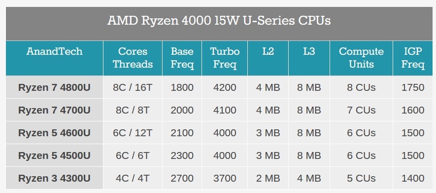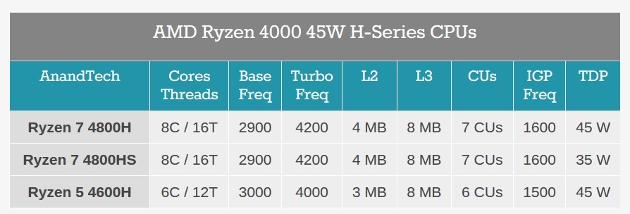 La serie H estará destinada a equipos gaming más potentes, e incluso habrá una variante exclusiva "HS" de 35 W de TDP que AMD ha desarrollado en colaboración con ASUS. Fuente: AnandTech.